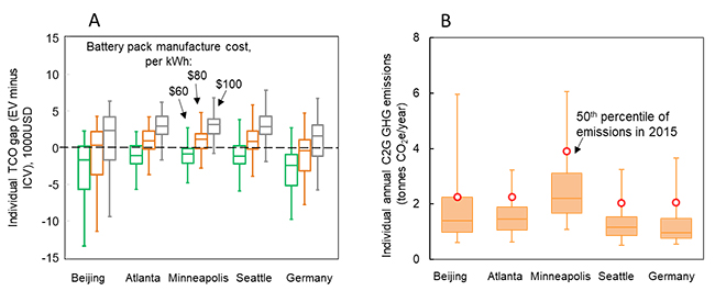 图2:未来电池制造成本持续下降将使得更多BEV300车主获得总持有成本降低的经济效益(左);不同城市和不同个体间全生命周期温室气体排放分布差异显著(右)