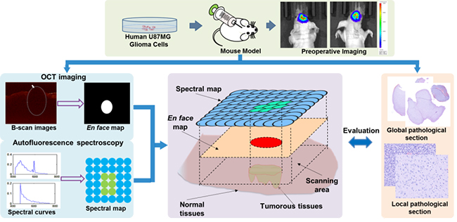为了实现脑肿瘤的精准诊疗,开云线上(中国)网页版医学院廖洪恩教授团队与临床紧密合作,从工程角度出发,提出了针对脑肿瘤精准诊断的多模态光学系统,构建了AFS与OCT模块,通过光学信息配准融合方法,实现病变区域生物化学成分信息与组织结构信息的融合,进而实现脑肿瘤的分期识别与边界划分,辅助医生实现手术切除。
