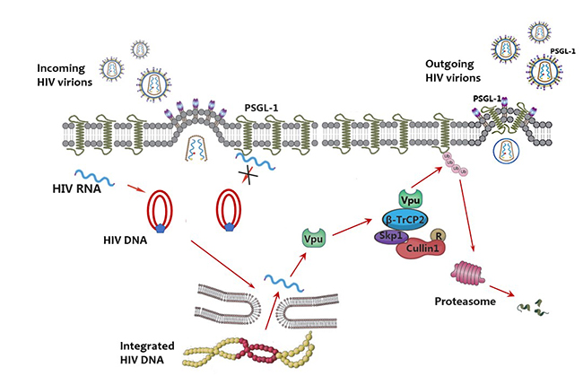 示意图:PSGL-1可以抑制病毒RNA逆转录合成DNA(1),也能被包装到新的病毒颗粒中,抑制其新一轮的感染(2)。病毒通过其附属蛋白Vpu结合PSGL-1并介导泛素连接酶SCF-βTrCP2泛素化PSGL-1,导致PSGL-1被蛋白酶体(proteasome)降解,从而逃逸PSGL-1对新生病毒感染的强烈抑制作用。