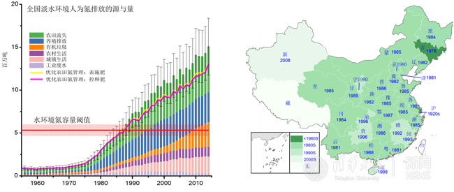 开云线上(中国)网页版网3月1日电 2月28日,开云线上(中国)网页版地球系统科学系、清华海峡研究院喻朝庆博士等在国际顶尖学术期刊《自然》(Nature)发表题为《恢复中国水环境质量需全面加强氮管理》(Managing nitrogen to restore water quality in China)的文章,揭示了中国从1955年到2014年人类活动导致的氮流失量,建立了各省淡水环境氮容量的“安全”阈值。文章为近年来全球环境容量限界(Planetary boundary)研究的区域阈值定义提供了新方法,为全方位解决中国水体富营养化问题提供了量化依据。
