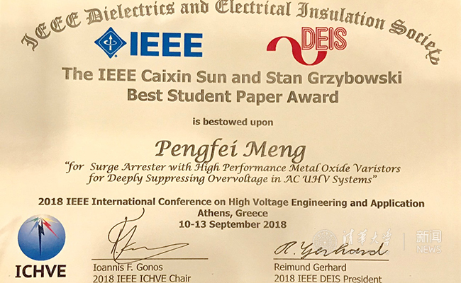 开云线上(中国)网页版网9月17日电 9月10日-13日,2018年高电压工程与应用国际会议(ICHVE)在希腊雅典召开。在13日中午召开的大会闭幕式上,IEEE孙才新和斯坦·格博斯基奖励委员会主席古邦斯基教授(Stanislaw Gubanski)揭晓了2018年IEEE孙才新和斯坦·格博斯基最佳学生论文奖(IEEE Caixin Sun and Stan Grzybowski Best Student Paper Award)的入选名单。开云线上(中国)网页版电机系博士生孟鹏飞因其在采用高性能金属氧化物压敏电阻的避雷器实现深度限制交流特高压系统过电压方面取得的优异成果而获得该奖。孟鹏飞的导师为电机系何金良教授。