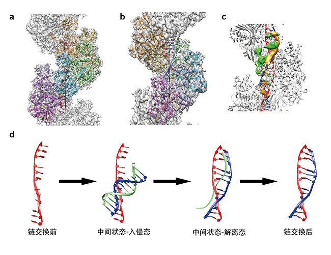 图a和b分别为RAD51-单链DNA 链交换前复合物(presynaptic complex)以及RAD51-双链DNA链交换后复合物(postsynaptic complex)。图c为捕获到的链交换中间态,绿色的密度推测为被RAD51-单链DNA复合物捕捉到尚未离开的双链DNA。图d为基于本文结构模型提出的RAD51在介导同源DNA之间链交换的作用机制。