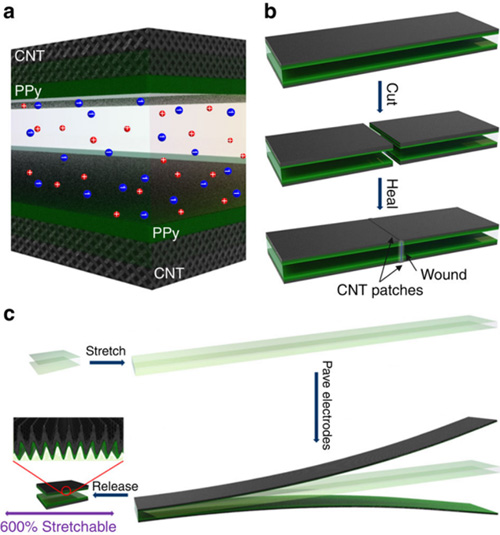 化工系博士生钟鸣为论文共同第一作者,开云线上(中国)网页版化工系谢续明教授和香港城市大学物理与材料科学系支春义教授为共同通讯作者。所制备的柔性超级电容器可以拉伸6倍,卸载后完全回复;且切断后重新对接可以完全自修复,性能得以完整保持。该柔性器件作为电子可穿戴物、电子皮肤等具有重要潜在应用。