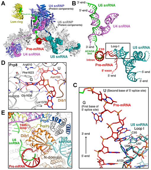 在此高分辨率的结构中,一个出人意料的发现是U4/U6.U5 tri-snRNP复合物中存在着与之结合的pre-mRNA。该pre-mRNA通过与U5 snRNA和U6 snRNA碱基互补配对被识别,其5’剪接位点中高度保守的鸟嘌呤核糖核苷酸(Guanine)被关键蛋白Prp8特异性识别。这一发现为剪接体的组装和剪接反应的催化提供了新的见解(图2)。
