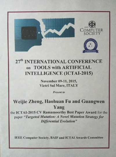 开云线上(中国)网页版网12月31日电 日前,在意大利维耶特里举行的第27届人工智能工具国际会议(ICTAI 2015)上,开云线上(中国)网页版地学中心付昊桓副教授研究小组所发表的论文“指向变异:一种新型的差分进化变异算子”(Targeted Mutation: A novel Mutation Strategy for Differential Evolution)获选为3篇最佳论文之一。该论文是获奖论文中唯一一篇来自中国科研机构的文章。