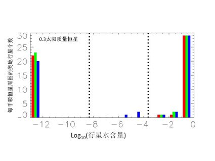 计算结果发现:在1000颗0.3太阳质量恒星周围存在6万9千颗行星,其中5千颗的质量在0.1到10地球质量范围,这些类地行星中55颗位于恒星主序阶段的宜居带内;而这些行星中有31颗海洋行星,23颗沙漠行星,只有1颗水含量接近地球。