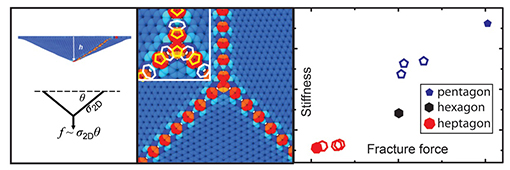 左图为缺陷几何效应对石墨烯力学响应的影响示意;中图为石墨烯中晶界处五、七边形拓扑缺陷分布;右图为纳米压痕测量力学响应时局部缺陷类型与其刚度、强度的关联。图中的五、七边形符号对应在三晶界交汇处的缺陷类型,六边形为单晶石墨烯的数据。