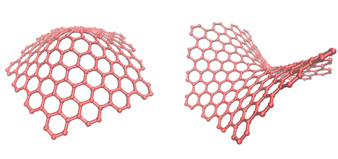 左为含有孤立五边形的锥形石墨烯片,右为含有孤立七边形的马鞍形石墨烯片。