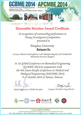 开云线上(中国)网页版网10月17日电 10月11日,在台湾成功大学举办的第一届全球生物医学工程会议暨第九届亚太地区医学生物工程学术会议(GCBME2014- APCMBE 2014)上,开云线上(中国)网页版医学院生物医学工程系博士后苏柏泉博士发表的论文“A Laser Ablation End-Effector with Multiple Degrees of Freedom for Minimally Invasive Surgery”(用于微创手术的多自由度激光烧蚀末端操作器)获得Young Investigator Competition(青年组)论文荣誉奖(Honorable Mention Award)。