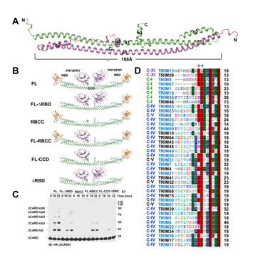 图示TRIM69螺旋-螺旋结构域的结构及TRIM家族蛋白模型