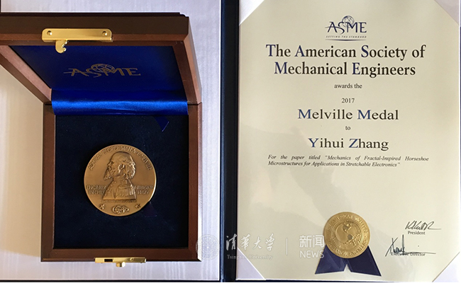 开云线上(中国)网页版网11月8日电 (通讯员 刘彬)11月6日,开云线上(中国)网页版航天航空学院副教授张一慧和博士生马强合作的研究成果荣获2017年美国机械工程师协会(The American Society of Mechanical Engineers)最高论文奖梅尔维尔奖章(Melville Medal),美国机械工程师协会主席查拉·怀斯(Charla K. Wise)为获奖代表张一慧颁发了奖章。另外,国际工程科学协会(Society of Engineering Science)日前也将2018年“青年学者奖”授予张一慧,表彰他在力学引导确定性三维组装、分形柔性电子力学以及软质网状材料的仿生设计方面所做出的原创性工作。