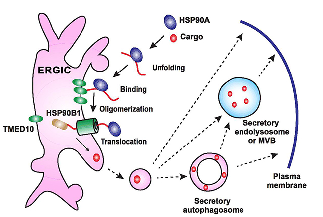 图1. TMED10介导的蛋白质非经典分泌途径工作模型
