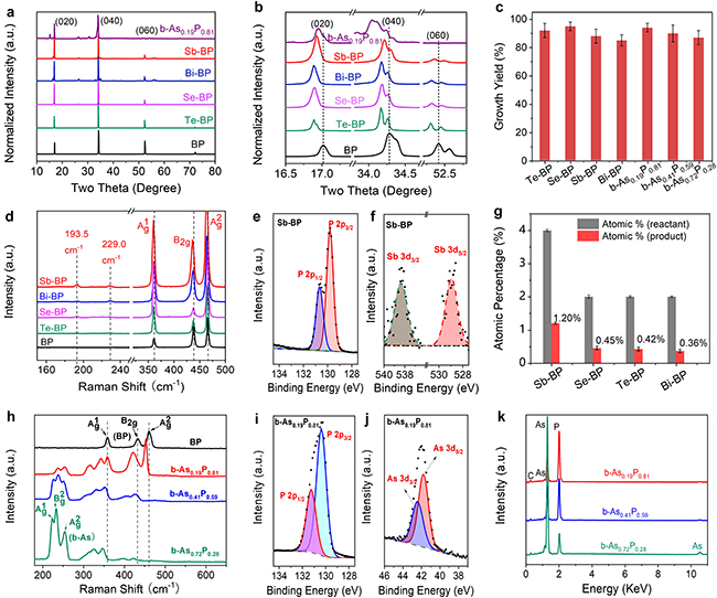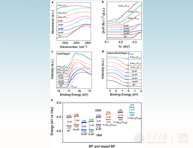 研究表明,此方法制备的掺杂黑磷(1.2wt% Sb, 0.45wt% Se, 0.42wt% Te, 0.36 wt% Bi, 72.8wt% As)具有目前报道最高的掺杂浓度,且掺杂原子种类较多(如:Se, Te, Sb, Bi, As, Co, Fe, Mn等),是一种普适性的掺杂方法。通过结构和光学表征显示,制备得到的黑磷及掺杂黑磷具有较高的结晶度和纯度。此外,该研究还发现掺杂可以有效调控黑磷的电子结构,包括调节黑磷的功函数和导带、价带的位置。理论和实验结果显示,适当元素(例如Sb,Te等)的掺杂可以有效提升黑磷的化学稳定性,提高黑磷的电学性能。以上研究结果对理解黑磷制备过程中的基础科学问题和生长机理研究具有重要指导意义,为基于黑磷的电子和光电子器件的基础研究和应用打下了坚实基础。