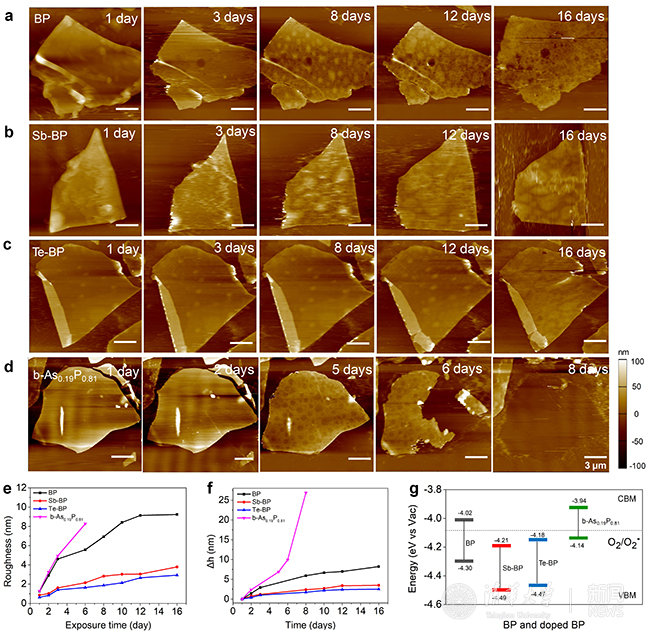 图5:暴露于环境中的黑磷及掺杂黑磷纳米片的稳定性研究