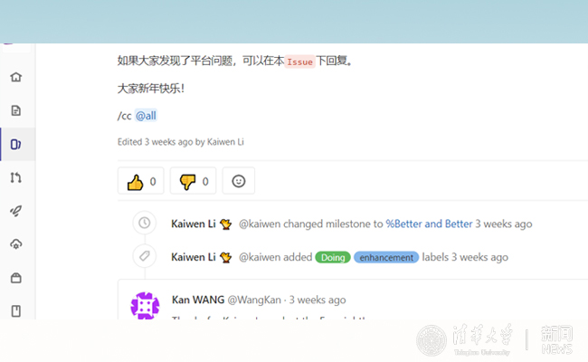 在这座“云上实验室”里,师生们远程指导、协作并进,科研进展同步更新。团队带头人王侃老师通过Reply by Email功能,实现研究方向上的把控和指导。青年教师梁金刚老师等通过直接参与讨论的方式,在Issue、Merge Request等开发过程中,给予同学们技术指导,推动研究生论文和科研课题的发展与完善。