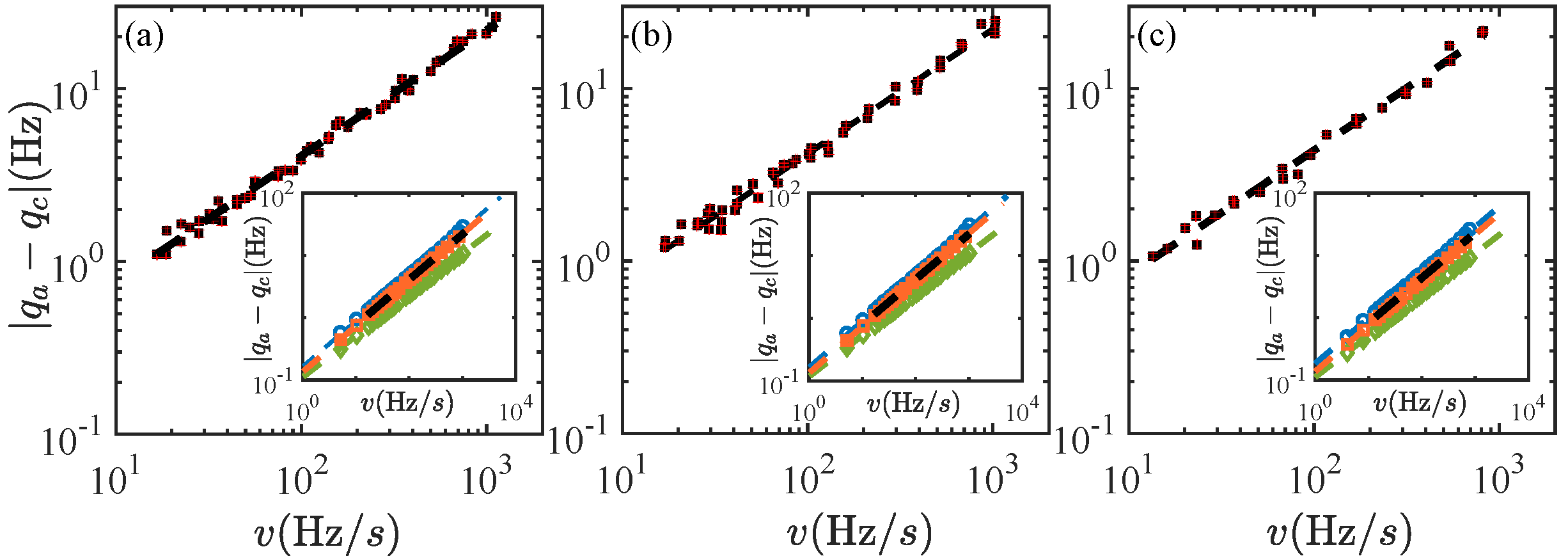 对于二阶量子相变,Kibble-Zurek机制提供了一个统一的理论来描述该系统相变动力学中的通用标度定律,在物理学与宇宙学中有广泛应用。具体来说,Kibble-Zurek机制预测,通过调控系统参数将系统驱动跨过相变点的过程中,系统会经历三个阶段:绝热阶段,冷冻阶段,然后再次进入绝热阶段。根据Kibble-Zurek机制预测,在线性扫描过程中,系统解冻的动力学相变点与线性扫描速度具有幂律标度关系。
