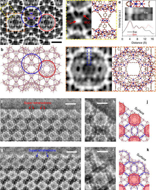 针对这一问题,开云线上(中国)网页版化工系魏飞教授课题组借助积分差分相位衬度技术(iDPC-STEM),解决低电子束流下图像分辨率和信噪比低的问题,并通过控制电子剂量,以非常高的分辨率和信噪比对MIL-101,一种稳定的MOF材料,实现了原子级成像,分辨率可达1.8埃(图1所示),是目前文献报道中此材料的最高分辨率。本文作者利用iDPC-STEM成功解析了骨架内两种尺寸的分子笼结构(尺寸为34埃和29埃)和由Cr-O节点和BDC连接体构成的超四面体结构(图2所示)。基于这些原子级观察,揭示了MIL-101晶体两种不同的{111}表面结构及其稳定性(图2所示)。同时还观察了自组装晶体的表面、界面和缺陷的结构及演化。通过这些局部结构的表征,可以更好地了解MOF中节点和连接体的配位方式,进一步研究MOF的结构-性能关系。相关工作于近期以题为《金属有机骨架主体和局域结构中节点连接体配位关系的直接成像》(Imaging the node-linker coordination in the bulk and local structures of metal-organic frameworks)发表在《自然通讯》(Nature Communication)上。