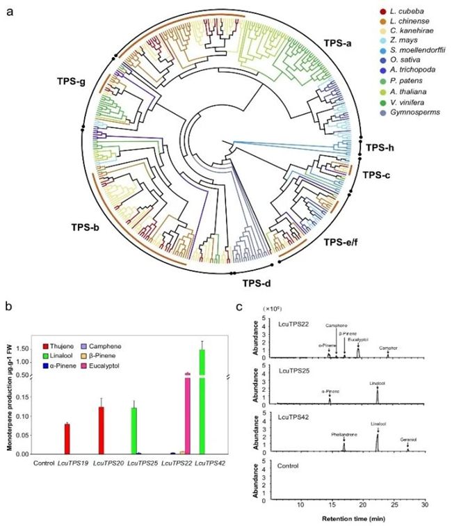 该研究进一步揭示了单萜合成酶基因家族mono-TPS在樟科发生了显著扩张,对樟科单萜化合物的多样性形成起到了重要作用,并通过瞬时过表达和酶活实验,鉴定了调控山苍子关键单萜化合物合成的关键基因。