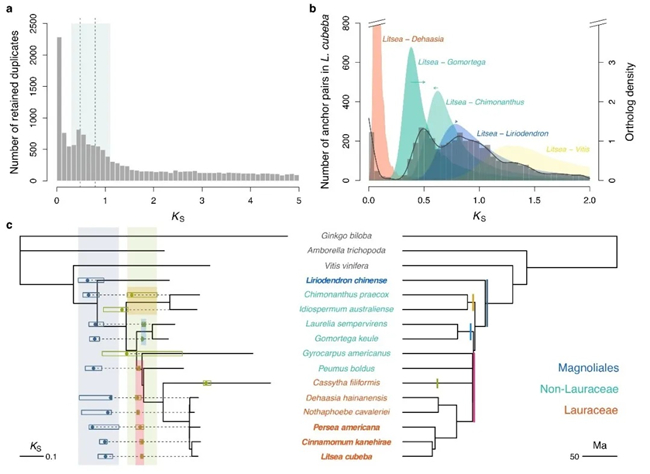该研究对山苍子的基因组测序获得了大小为1.37G,contig N50为607.34 kb的基因组,运用Hi-C技术,进一步将基因组锚定到24条染色体,锚定率94.56%,Scaffold N50达到1.76 Mb,获得质量优良的山苍子基因组图谱。为开展樟科形态演变和香味合成的分子基础研究,对樟科在中国分布的20属47代表种进行了低盖度基因组测序,16个属23代表种进行了混合组织和花苞转录组测序。基于山苍子基因组图谱和樟科各属代表种组学信息,首先揭示了不完全谱系分选对木兰类与单双子叶植物分化起重要作用,为樟科复杂的系统发育关系提供了新的证据;基因组复制事件(WGD)表明,山苍子发生了两次WGD事件,古老的一次发生在樟目和木兰目分化前,近一次发生在樟科内部分化之时。