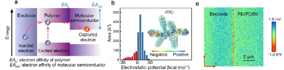 a:聚合物-分子半导体复合体系能级与电荷转移示意图 b:分子半导体静电势分布 c: 电极/聚合物界面表面电势分布