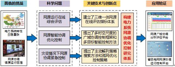 “电力系统智能网源协调与优化控制技术及应用”研究内容和创新点示意图