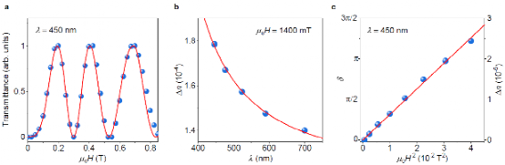 该研究提出了一种基于宽带隙磁性二维材料的双折射液体的制备方法,所制备的掺钴二维钛氧化物晶体分散液呈现了巨磁致双折射效应,其磁光克顿-穆顿系数达1400T-2m-1,高出传统双折射液体近两个量级。同时,本研究还从理论上阐释了可调制透明干涉色出现的光学基础是双折射液体对偏振光的相位差调制需达到3π以上。本研究中的二维晶体分散液因同时具有高透光率及巨磁致双折射效应,故而在较低磁场下(<0.8T),实现了对偏振光的大相位调制(8π)。因此,基于磁调控的透明干涉色现象被首次报道,其峰值波长在可见光范围内呈现了双周期循环。本研究采用的掺钴二维钛氧化物材料可以拓展至其他宽带隙磁性二维材料体系,以及透明铁磁液晶体系。该工作加深了研究人员对磁光克顿-穆顿效应机理的认识,在拓展二维材料在光学调制、生物医学、探测监测等领域的应用方面具有一定的指导意义。