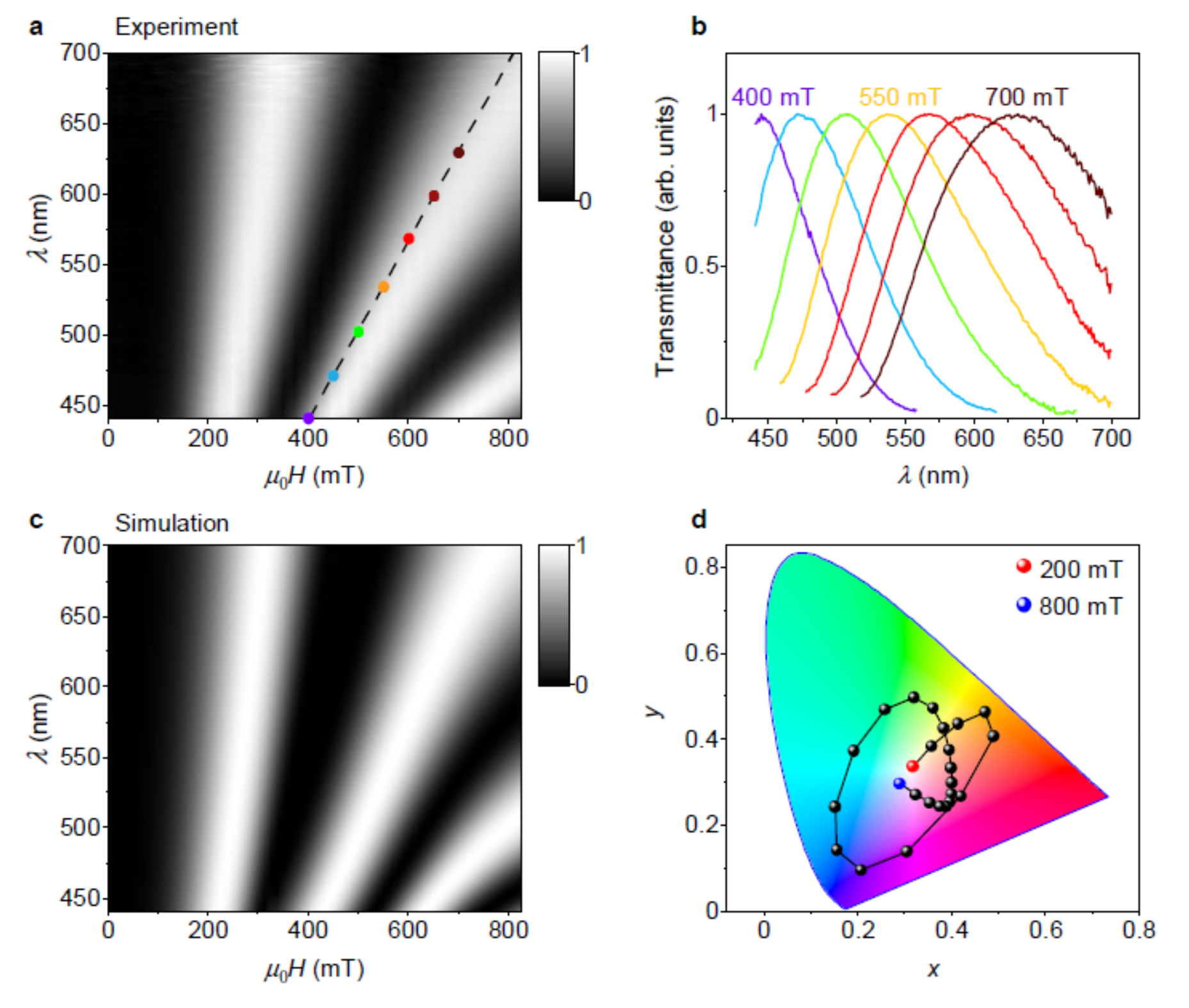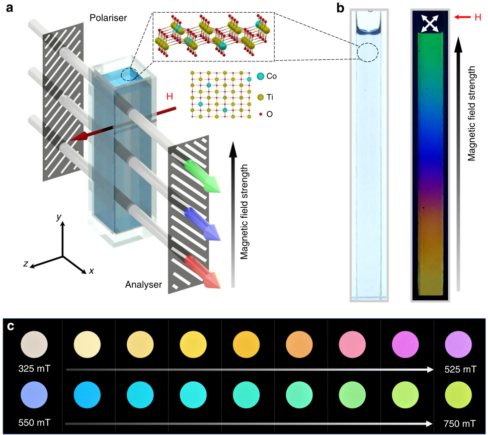 本文正是基于该想法,采用了一种以磁性元素钴掺杂的二维钛氧化物纳米片为代表的宽带隙磁性二维材料做双折射液体的活性材料。所采用的二维材料几何各向异性比(横向尺寸除以厚度)达到了103的量级,高出棒状液晶和一维材料液晶一到两个数量级。由此带来了高双折射率和高各向异性的磁化率。在0~0.2T的磁场驱动范围内,双折射率与磁场强度的平方呈现了完美的线性关系,证实了磁光克顿-穆顿效应(Δn=CλB2)的存在。通过对该线性区间的拟合,得到了C值为1400T-2m-1,高出其他低维材料液晶近两到三个量级。其中所述的0.2T磁场完全可以由两个纽扣大小的永磁体提供,有望全面发挥上面所述磁驱动的优势。此外该二维材料分散液还因具有高透光率,其在正交偏振片下,呈现与磁场一一对应的透射干涉色现象,这是研究人员首次观察到透射干涉色的磁调控现象。为将来透射式颜色领域的诸多新应用打开了大门,如可视化磁传感、透明彩色打印、磁调控滤色膜等。