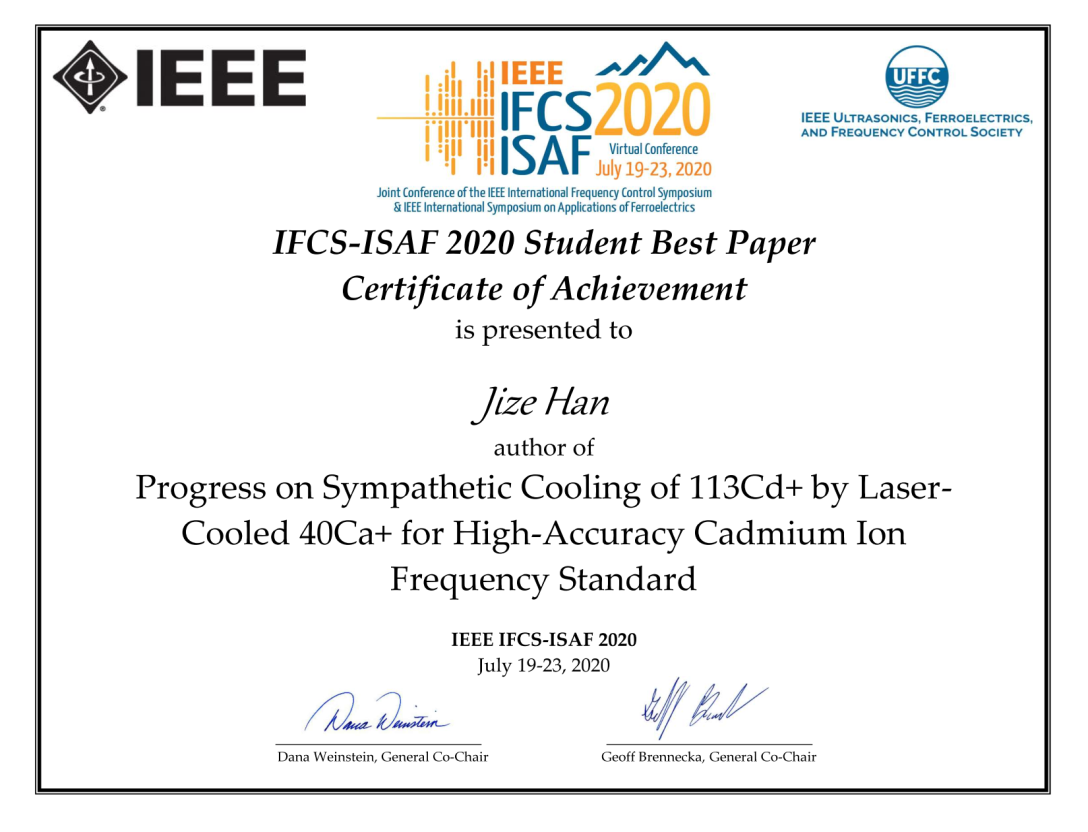 开云线上(中国)网页版网8月3日电 近期,开云线上(中国)网页版王力军教授研究组博士生韩济泽的论文“基于钙离子协同冷却镉离子微波频标研究进展”(Progress on Sympathetic Cooling of113Cd+by Laser-cooled40Ca+for High-accuracy Cadmium Ion Frequency Standard)在2020年度国际频率控制和铁电应用联合大会(Joint Conference of the IEEE International Frequency Control Symposium & IEEE International Symposium on Applications of Ferroelectric,简称IEEE IFCS-ISAF)入围学生最佳论文(Student Best Paper Finalists),并最终获得优胜奖(Student Paper Competition Group Winner)。韩济泽是本次大会唯一来自中国大陆的获奖学生。