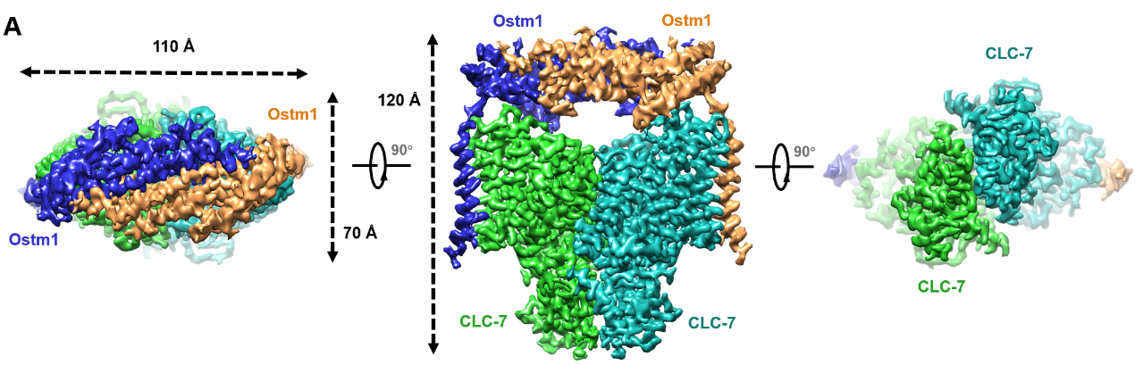 研究团队使用哺乳动物细胞系统表达纯化了CLC-7/Ostm1的复合物,并通过冷冻电镜第一次解析了CLC-7与辅助亚基Ostm1的复合物结构。CLC-7/Ostm1复合物结构显示高度糖基化的Ostm1在空间上像“帽子”一样位于CLC-7上方,并与CLC-7形成相互作用。