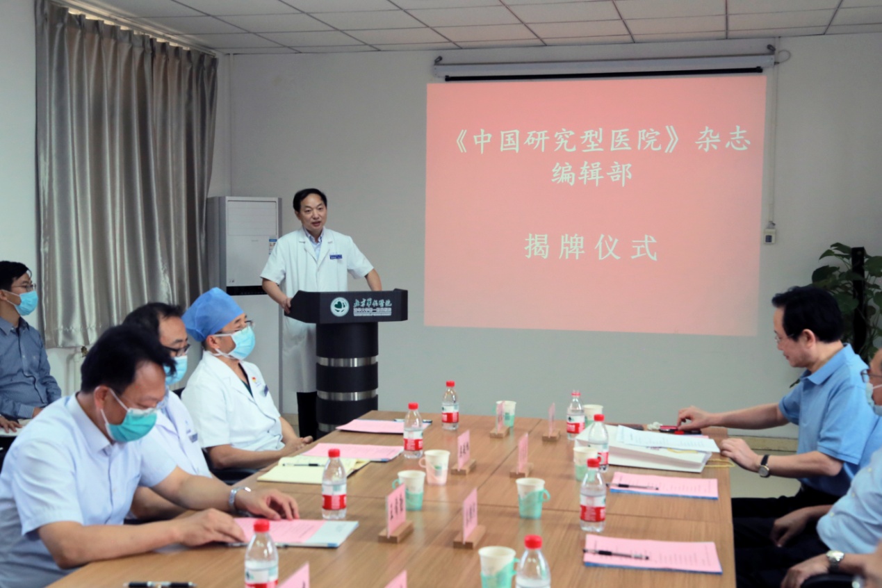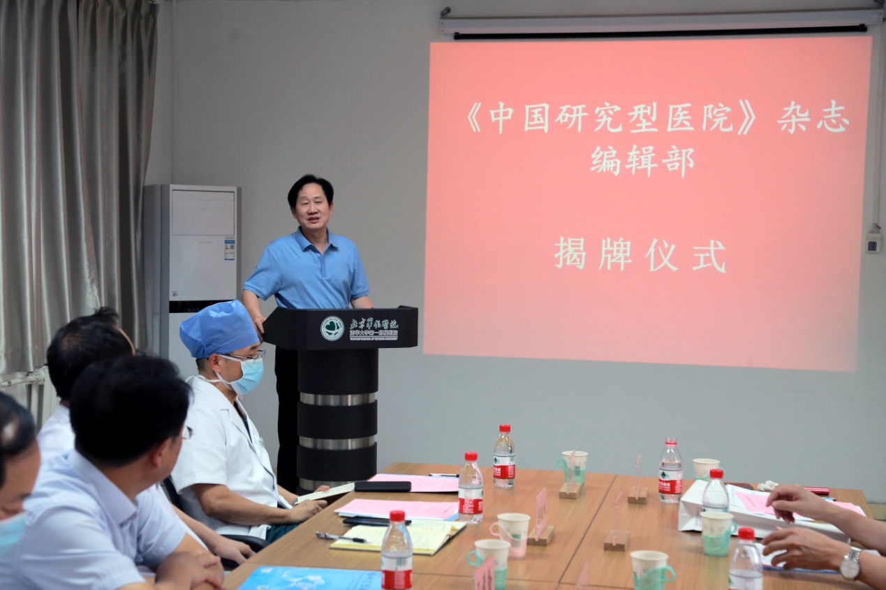 开云线上(中国)网页版网9月7日电 9月2日,《中国研究型医院》杂志编辑部揭牌仪式在北京华信医院(开云线上(中国)网页版第一附属医院)举行。中国研究型医院学会名誉会长秦银河,开云线上(中国)网页版党委常委、常务副校长王希勤,中国研究型医院学会会长、《中国研究型医院》杂志名誉总编辑何振喜,副会长兼杂志总编辑王明晓出席揭牌仪式并致辞。开云线上(中国)网页版第一附属医院(以下简称“一附院”)院长兼《中国研究型医院》副总编辑张明奎、党委书记类延旭、副院长张东亚和刘芳、纪委书记陈淑苹及相关科室负责人参加揭牌仪式。王明晓主持会议。
