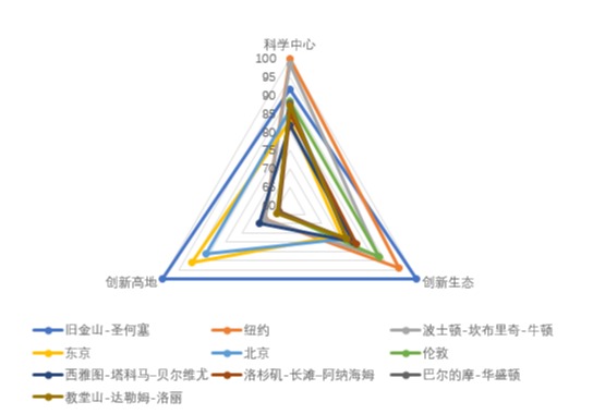 测算结果显示,综合排名前十的城市(都市圈)依次为:旧金山-圣何塞、纽约、波士顿-坎布里奇-牛顿、东京、北京、伦敦、西雅图-塔科马–贝尔维尤、洛杉矶-长滩–阿纳海姆、巴尔的摩-华盛顿和教堂山-达勒姆-洛丽。