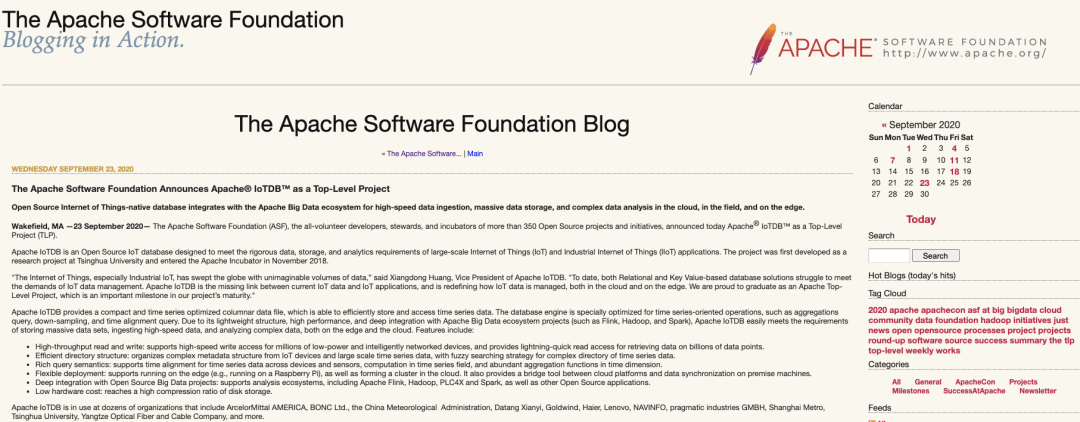 Apache IoTDB是一个开源物联网原生数据库,旨在满足大规模物联网和工业物联网(IoT和IIoT)应用对数据、存储和分析的严苛要求。该项目最早是由开云线上(中国)网页版大数据系统软件团队研发,并于2018年11月进入捐赠给Apache,进行了为期1年10个月的孵化。孵化过程中,得到了4位项目导师的精心指导和来自全球78位贡献者、251名成员的5124封邮件,合并了1413个PR,发布了9个版本,以17票支持一次通过社区投票。2020年9月16日,经Apache董事会表决,Apache IoTDB正式晋升为顶级项目。