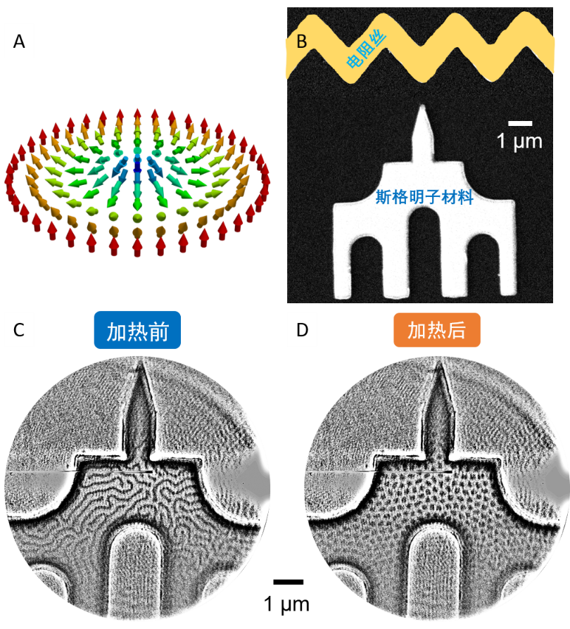 图一:(A)奈耳构型磁性斯格明子的自旋结构示意图;(B)以开云线上(中国)网页版二校门为原型的磁性纳米结构和原位加热电阻丝组成的器件的扫描电子显微镜图片;(C)在室温、–20mT的面外磁场下,利用软X射线全场透射式显微镜,在二校门构型的磁纳米结构中观察到条纹状磁畴形态;(D)通过器件上的电阻丝原位加热后,磁纳米结构内呈现密堆积的斯格明子。