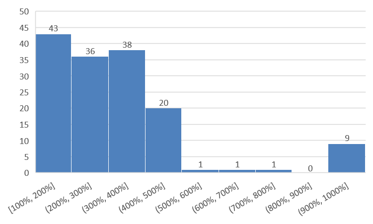 在消费乘数和抵扣面额方面,报告显示,大部分地方政府消费券在设计时,不同面额消费券的“预期杠杆”是相等的;但也存在部分地方政府不同面额的消费券所对应的“预期杠杆”并不相等。例如鄂州市的消费券抵扣规则为“满30减10,满50减20,满100减50”。在符合条件的149个省市级政府中,绝大多数省市级政府消费券的杠杆率在100%~400%内。