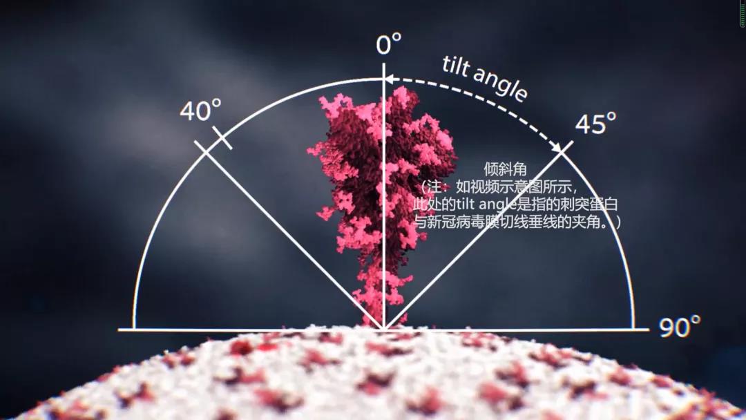 视频形象展现了刺突蛋白与新冠病毒膜切线垂线的夹角,以及刺突蛋白在病毒膜表面摆动的角度范围。
