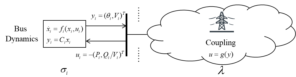 节点动态与网络耦合关系示意图:海量异构非线性节点动态通过输入-输出端口经电气网络相互耦合形成一个复杂电力系统,本文所提方法将系统整体的稳定性分解为节点部分微分无源性指标