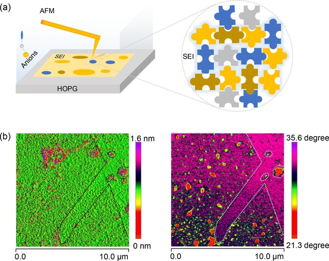通过在高温定向热解石墨(HOPG)上的沉积实验进一步验证了SEI二维渐进形核与生长。原子力显微镜(AFM)下观测到了HOPG表面上生长出的高度为1.6 nm的晶体颗粒,该空间下无法容纳三维生长的物种存在,AFM下的相图分析也表明HOPG表面生长出的晶核以二维形式铺展,相互间呈现出马赛克形式的拼接,直至覆盖整个电极表面。
