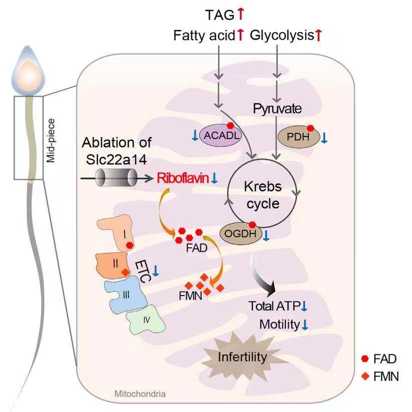 作为一个转运蛋白,SLC22A14的细胞内定位是什么以及通过转运何种底物来发挥作用的呢?作者利用蛋白质质谱分析技术和超高分辨率显微成像技术发现,SLC22A14是定位于精子线粒体内膜的转运蛋白。精子是高度特化的一类细胞,无法大量体外扩增,并且在体外存活时间短,很难分离出有活性的线粒体。因此,作者采用SLC22A14过表达稳定细胞系作为研究模型,结合线粒体代谢组学、放射性或非放射性同位素标记底物摄取实验以及核黄素缺乏的小鼠模型,鉴定出了核黄素为SLC22A14的底物之一。核黄素是FMN和FAD的前体,是FAO、TCA循环、ETC复合物I和II的辅因子。此外,作为抗氧化剂,核黄素还可以保护细胞免受氧化损伤。Slc22a14基因敲除干扰核黄素进入线粒体基质的运输过程,导致FMN和FAD耗竭和黄素酶活性降低,从而抑制ATP的合成,诱发精子功能损伤以及雄性不育。
