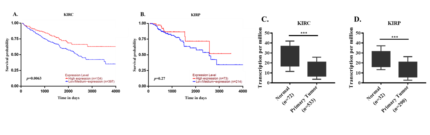 HMGCR表达水平对肾癌患者生存的影响(C)肾透明细胞癌(D)肾乳头细胞癌