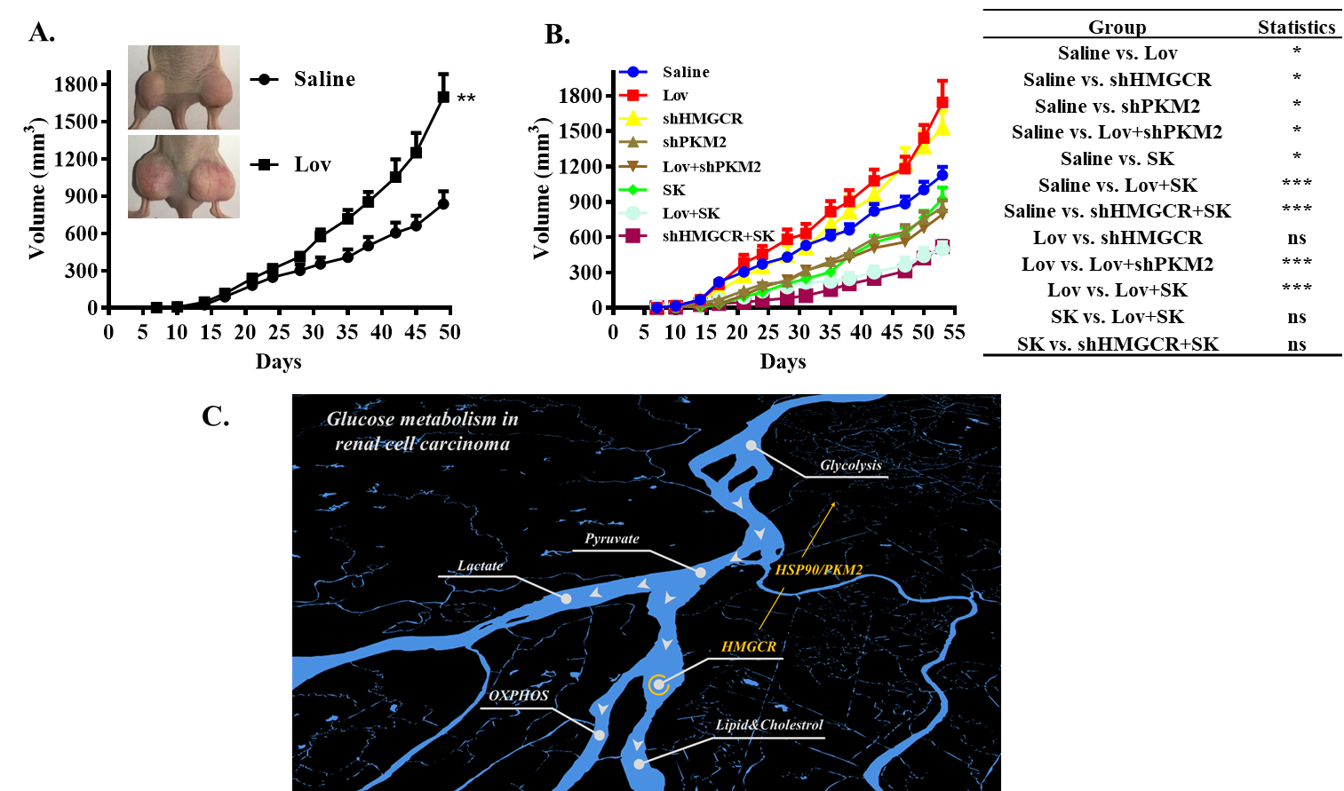 (A)荷瘤小鼠使用洛伐他汀(Lov)抑制HMGCR后RCC移植瘤的生长情况;(B)HMGCR受抑制的小鼠模型中使用PKM2抑制剂干预糖酵解可获得抗肿瘤效应;(C)RCC细胞整体糖代谢过程中HMGCR调控糖酵解示意图