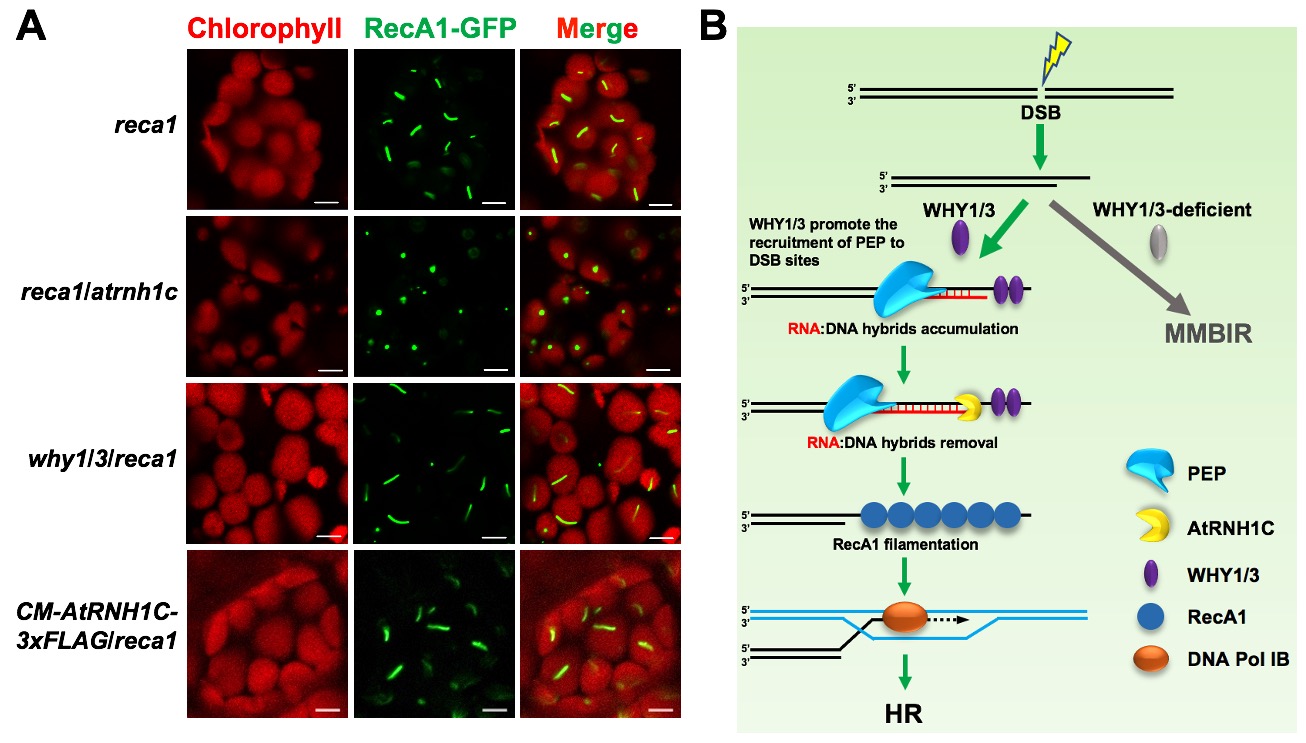 开云线上(中国)网页版网6月18日电 正确修复受损DNA对基因组完整性和个体发育至关重要。作为半自主细胞器,植物的质体必须通过一系列机制来维持自身基因组完整。开云线上(中国)网页版孙前文实验室的最新研究发现RNA:DNA hybrids结构协助拟南芥叶绿体基因组DNA双链断裂修复的全新分子机制,证实RNA:DNA hybrids在促进同源重组修复和叶绿体细胞器发育过程中的积极作用,揭示了RNase H1蛋白AtRNH1C与单链DNA结合蛋白WHY1/3和重组酶RecA1在共同维持叶绿体基因组完整性过程中发挥着举足轻重的作用。