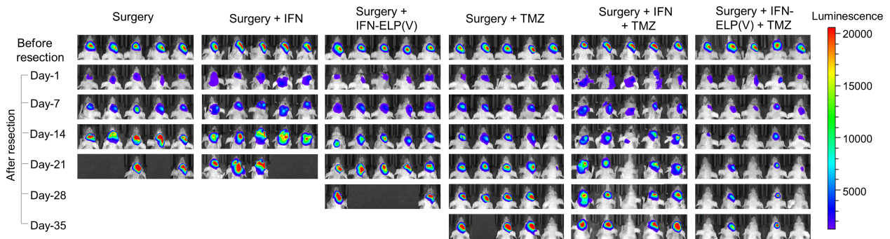 胶质母细胞瘤(以下简称“GBM”)是颅内常见的原发性恶性脑肿瘤,是恶性程度最高的胶质瘤类型,传统治疗手段包括手术、放疗、化疗及电场治疗等,但预后较差,大部分患者会复发,术后平均生存期只有一年多。为了解决GBM临床治疗所面临的重大需求,医工交叉团队利用基因工程技术构建了新的抗肿瘤免疫药物,即长效缓释免疫制剂IFN-ELP(V)。三年多来,王贵怀与高卫平带领开云线上(中国)网页版临床医学院神经外科学2017级博士生梁平和生物医学工程系2014级博士生王卓然,通过基础的质粒构建、蛋白药物的提取,相关的细胞实验以及后期大量的动物模型实验,证明了该药物在GBM手术切除腔中能够产生早期的抗肿瘤免疫反应,而与替莫唑胺化疗相结合后,能够明显改善肿瘤模型的生存预后,相对传统治疗手段,是一种生物安全、有效的GBM治疗新策略。