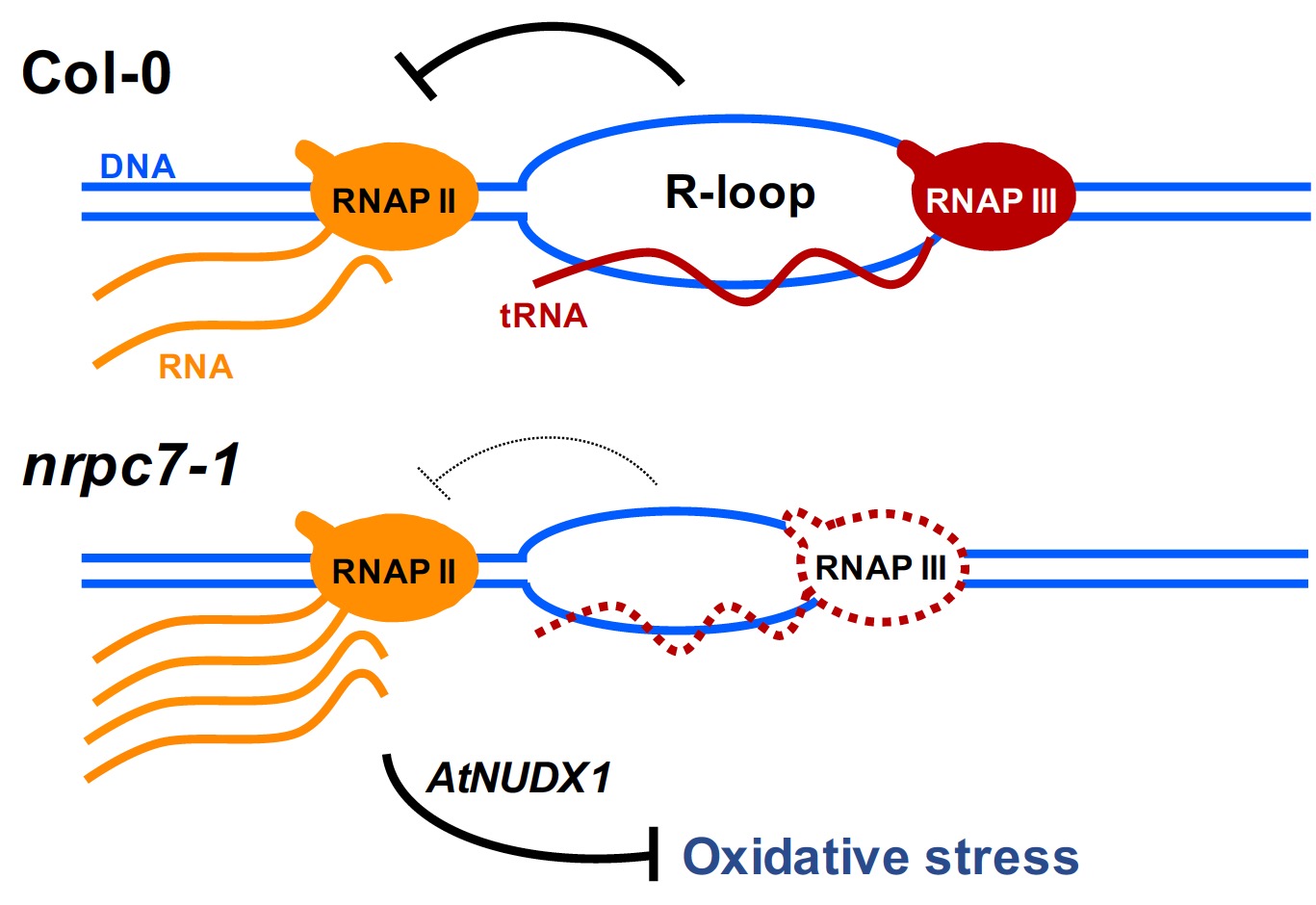 孙前文实验室根据tRNA基因与其它基因(非tRNA基因)的相对位置,把tRNA基因进行分类,发现基因内的tRNA基因具有较高的正义R-loop,并且这种现象在人基因组中保守存在。在RNA聚合酶III(RNAPIII)突变体nrpc7-1中,基因内tRNA形成的R-loops减少。NRPC7与转录延伸状态的RNA聚合酶II(RNAPIIS2P)在基因内tRNA基因上共定位,并干扰RNAPIIS2P的转录延伸。相反,在抑制RNAPII延伸后,NRPC7在基因内tRNA基因上的结合增加。RNAPIII抑制部分tRNA宿主基因的转录,并且这种抑制依赖于基因内tRNA形成的R-loops。此外,减轻基因内tRNAPro形成的R-loops对其宿主基因AtNUDX1的抑制可增强拟南芥对氧化胁迫的耐受性。以上结果表明基因内tRNA形成的R-loops通过调控RNA聚合酶间的转录干扰来调节宿主基因的表达以响应环境胁迫。