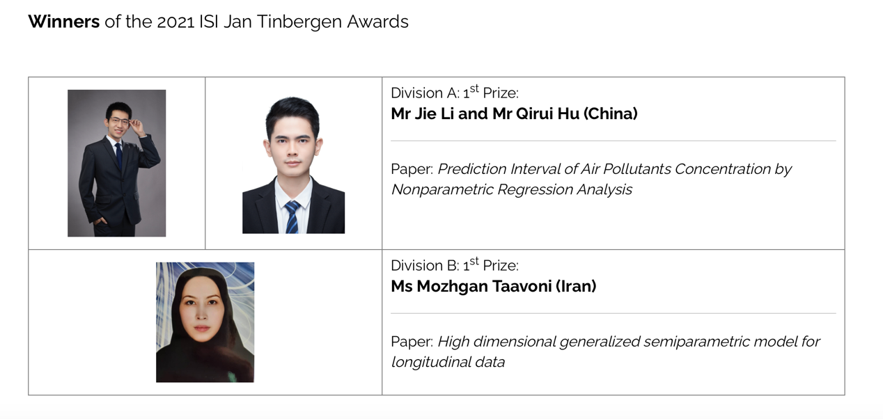 总部在荷兰的国际统计学会(ISI)是全球三个权威统计学学术组织之一,旨在引领、支持和促进全世界对统计学的理解、发展和良好实践。ISI颁发的各类荣誉奖项都被国际统计学界高度认可。简·丁伯根奖命名于获得1969年首个诺贝尔经济学奖的荷兰学者简·丁伯根,是从每两年举行一次的世界统计学大会(World Statistics Congress, WSC)青年统计学者(1987年以后出生)提交的论文中评选的最佳论文。其中Division A的获奖论文必须解决一个对广大发展中国家具有实际意义的应用统计问题。