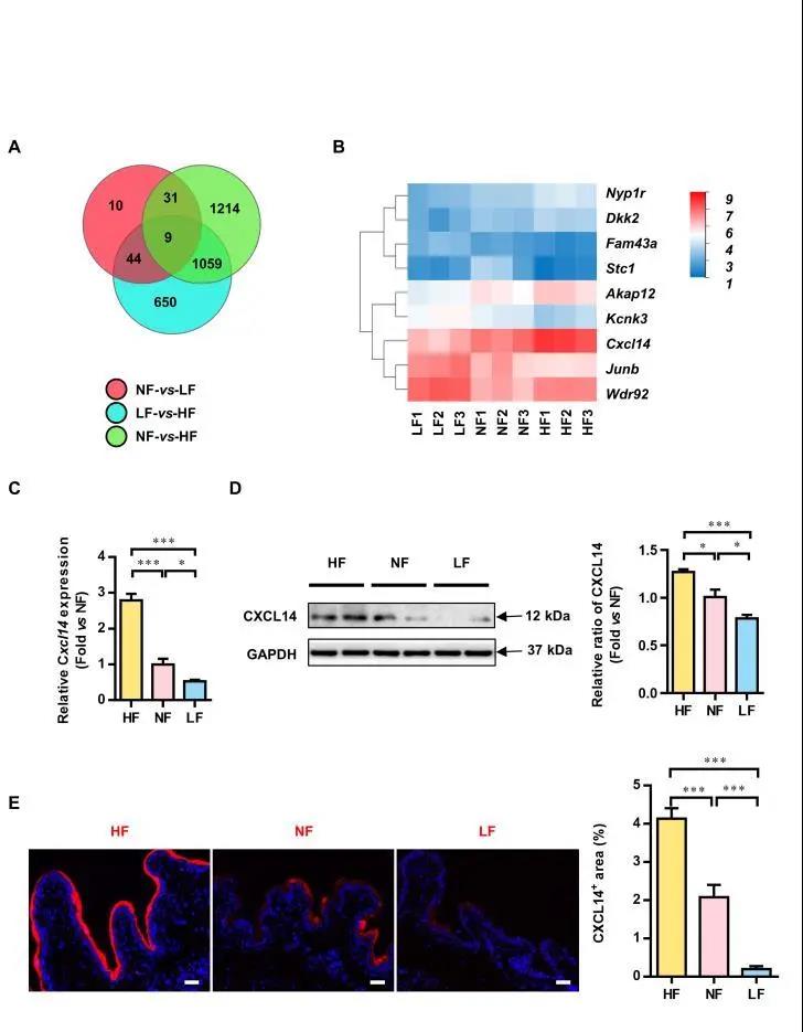 在探究富脂饮食减缓小鼠原发性膀胱结石形成机制时,作者选择短期4周饮食干预的时间点。通过检测影响结石形成的钙、酒石酸浓度,各种无机盐离子水平,影响钙吸收激素水平等指标的变化,推测出可能是生物学性质的改变,而不是物理化学的变化,影响了结石的形成。富脂饮食组小鼠尿液和血液中较高水平的游离脂肪酸参与了维持该组小鼠膀胱上皮组织正常微观结构的作用。进一步通过转录组测序,对三组小鼠膀胱组织RNA转录组测序的结果进行分析,结果显示,富脂饮食组(HF组)小鼠膀胱组织中CXCL14的表达显著升高(图2)。