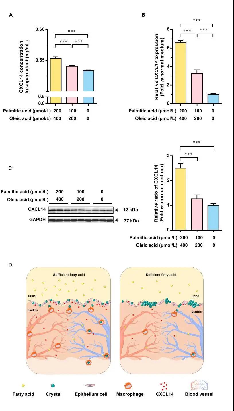 为了进一步验证脂肪酸的作用,作者在体外培养了人膀胱上皮HCV-29细胞,通过向HCV-29细胞培养基中添加不同浓度的游离脂肪酸,然后测定细胞和培养基上清中CXCL14的表达情况。结果显示(图4),额外添加游离脂肪酸24小时后,会使得HCV-29细胞和细胞培养基上清中CXCL14的表达量均显著升高,并且CXCL14升高的趋势与脂肪酸的添加量呈正比,因此,进一步证实添加脂肪酸提升了HCV-29细胞分泌CXCL14表达。
