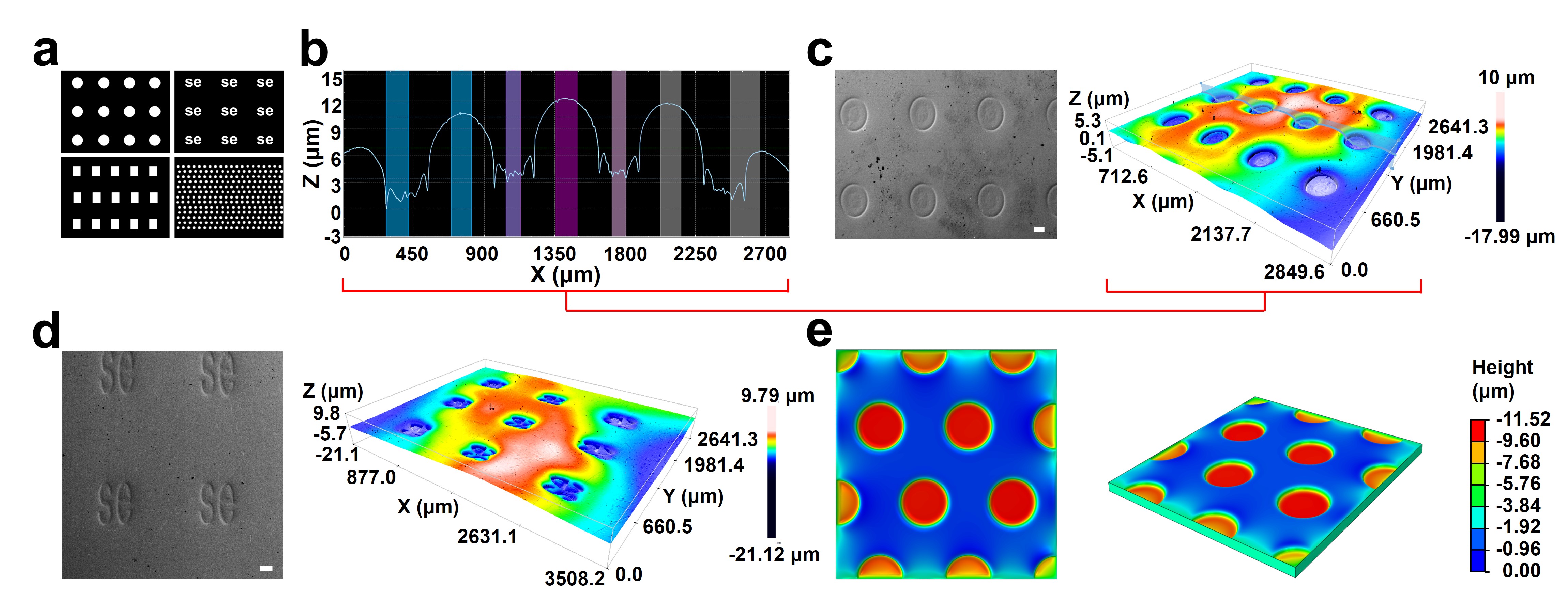 除宏观变形之外,该材料还可以用于微观三维图案的光学打印过程。将该材料进行拉伸并在特定位点进行辐照。经过加热收缩之后,可以在材料的表面形成各种各样的三维图案。该图案化方法简单有效,可用于多种不同形状和尺寸的三维微图案的制备。