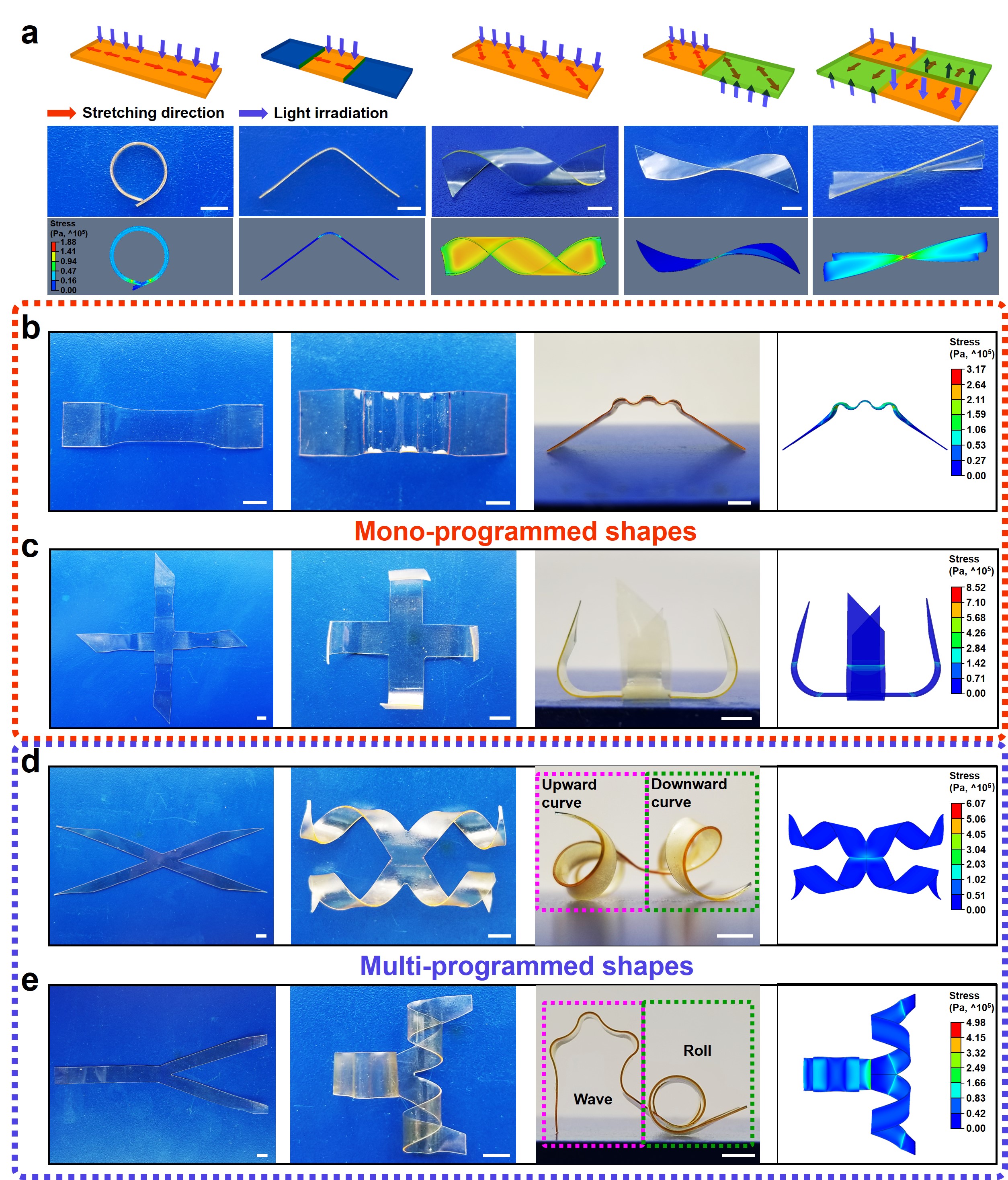 通过将不同的应力方向、辐照区域和辐照方向进行组合,可以实现材料的一系列基础变形,这其中包括弯曲、折叠、扭转、螺旋等多种不同的变形模式。通过控制双臂材料的辐照方向可以实现不同弯曲方向交替排列的波浪状结构。通过对四臂材料进行拉伸并辐照,可以实现具有相同弯曲方向的花型结构。除了重复的同种变形之外,利用该形状编程方法还可以将波浪状和螺旋状等不同的变形模式集成到同一块材料中以实现更为复杂的形变。此外,利用有限元分析对材料的应力梯度和变形过程进行仿真,可以对材料的变形模式进行模拟和预测。