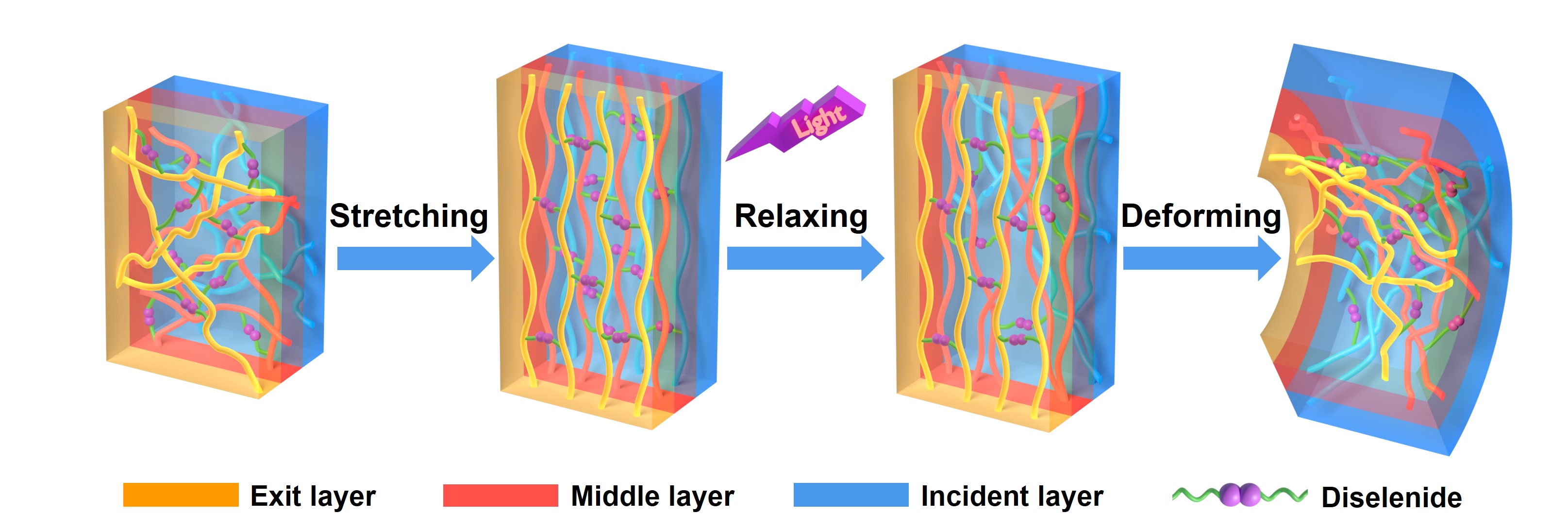 为了解决形状记忆材料应力编辑和形状回复相互干扰的问题,同时为了提高材料应力编辑的时空分辨率,化学系许华平教授课题组通过向形状记忆聚合物中引入光响应的二硒键,成功地实现了材料在无约束状态下的三维形状光编程。该团队利用光强在材料中的衰减过程和二硒键对不同光强的响应性差异,成功地在材料厚度方向上制备形成了应力梯度,通过对该梯度应力进一步热激活可以引发材料的不对称收缩,从而完成整个材料的面外弯曲过程。