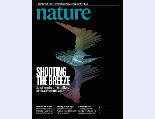 研究成果于9月22日在《自然》(Nature)期刊以长文形式发表,题目《受风传种子启发的三维电子微型飞行器》(Three-dimensional electronic microfliers inspired by wind-dispersed seeds),为同期的封面文章(图3)。